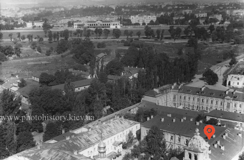 1930-ті. Вид з Великої дзвінниці Києво-Печерської Лаври (Всеукраїнське музейне містечко) На фото відмічено будівлю, в якій нині знаходиться Бібліотека |