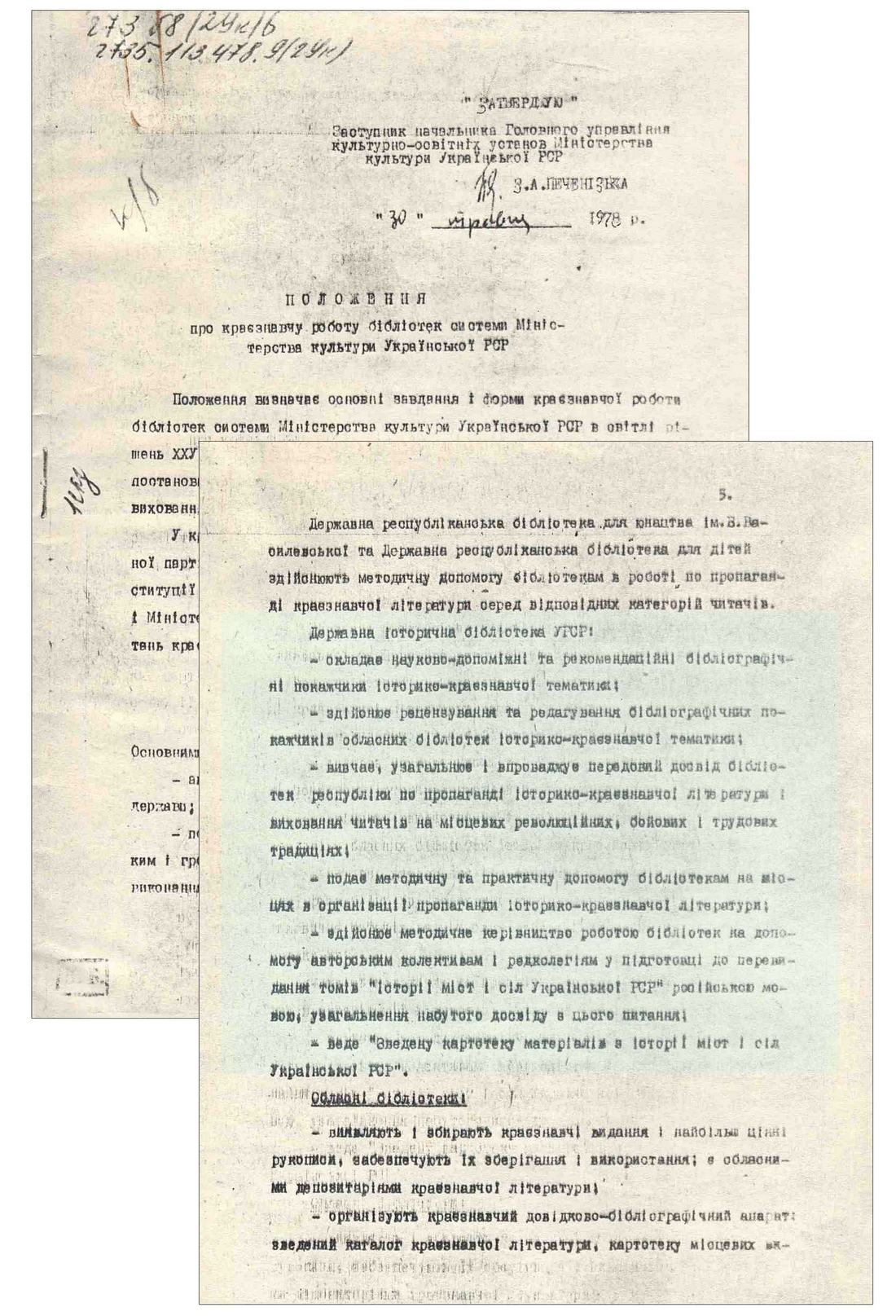 Затверджено «Положення про краєзнавчу роботу бібліотек системи Міністерства культури Української РСР», в якому на ДІБ покладено завдання методичного керівництва бібліотеками на місцях у справі складання бібліографічних посібників історико-краєзнавчої тематики.