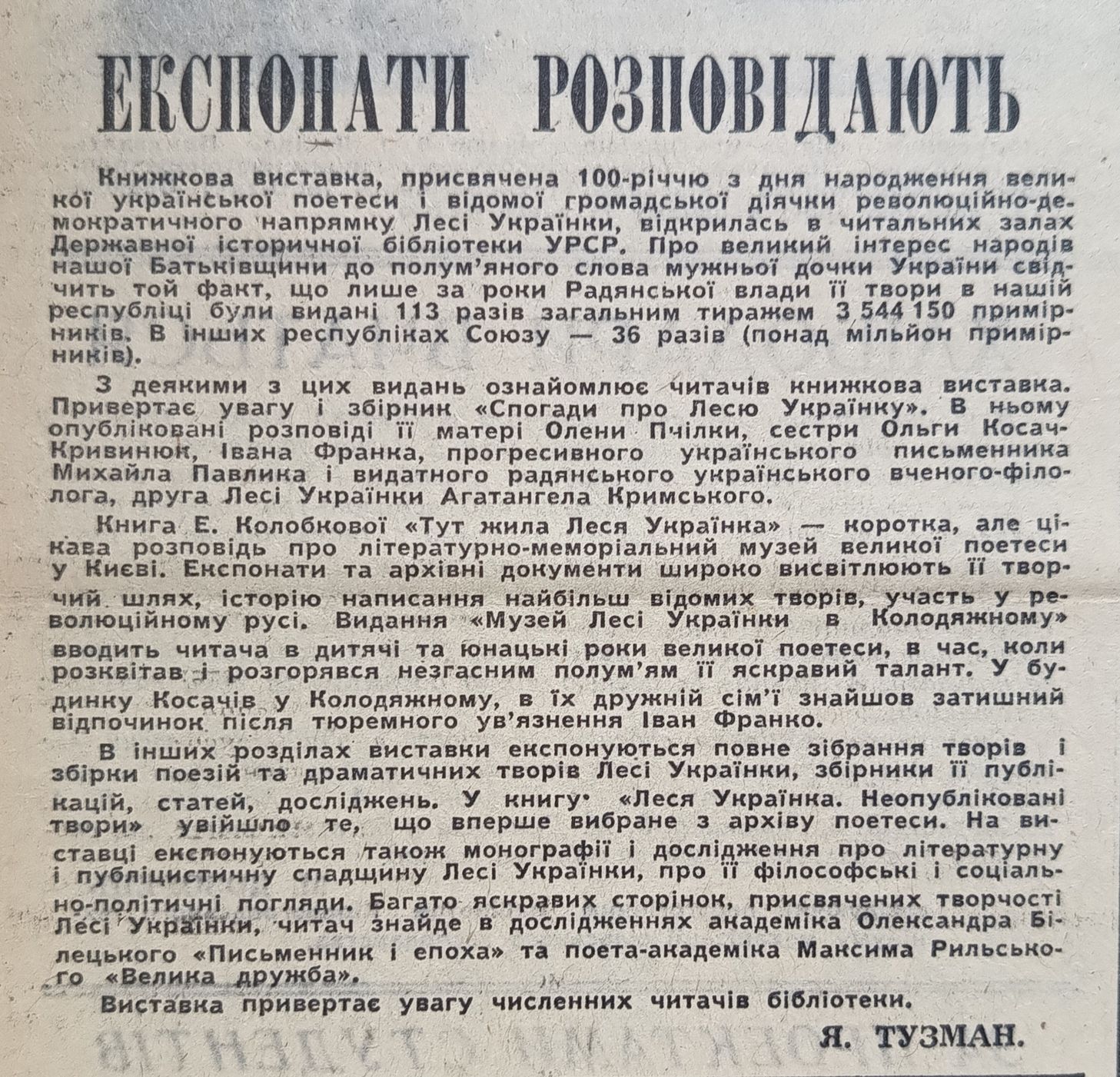 Тузман Я. Експонати розповідають. Рад. освіта. 1971. 20 січ.