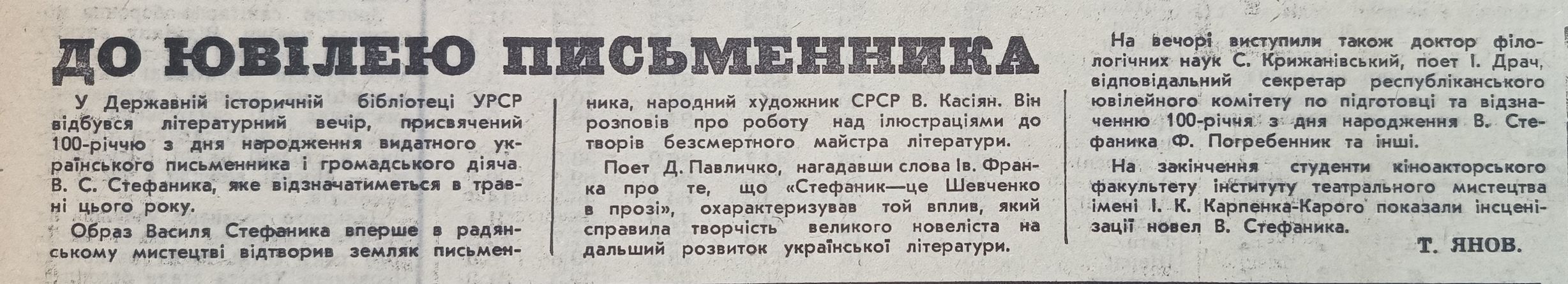 Янов Т. До ювілею письменника. Київ. правда. 1971. 17 квіт.