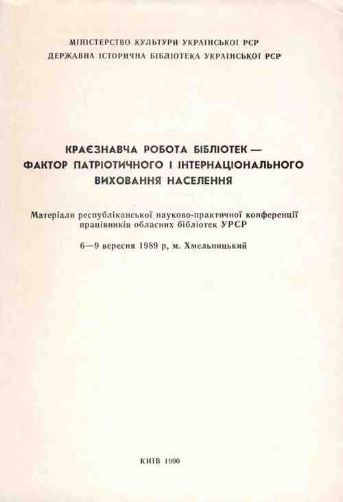 Краєзнавча робота бібліотек – фактор патріотичного і інтерна-ціонального виховання населення: матеріали респ. наук.-практ. конф. працівників обл. б-к УРСР, 6-9 верес. 1989 р., м. Хмельницький. К., 1990. 155 с.