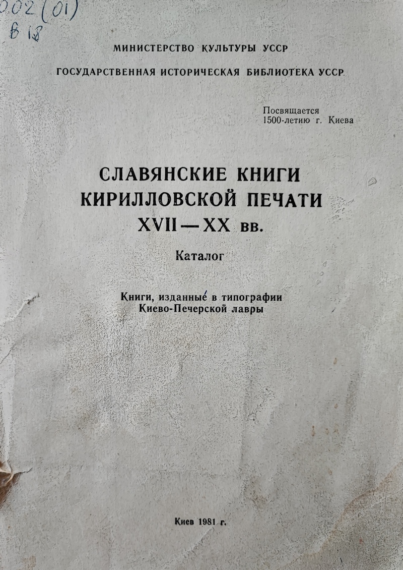 Славянские книги кирилловской печати ХVII-XX вв.: каталог книг, изданных в типографии Киево-Печерской Лавры / склад.: Г. Є. Варварич. К., 1981. 79 с.