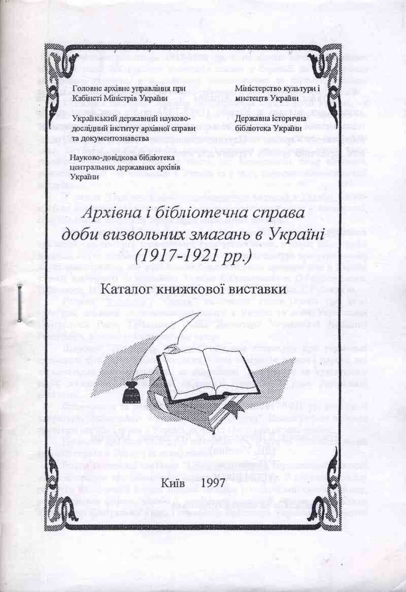 Архівна і бібліотечна справа доби визвольних змагань в Україні (1917-1921 рр.): каталог кн. виставки / Наук.-довід. б-ка центр. держ. архівів України, Держ. іст. б-ка України; склад. Л. Ястремська, М. Лук’яненко, З. Мусіна (ДІБ України), Г. Порохнюк (НДА України). Київ, 1997. 58 с.