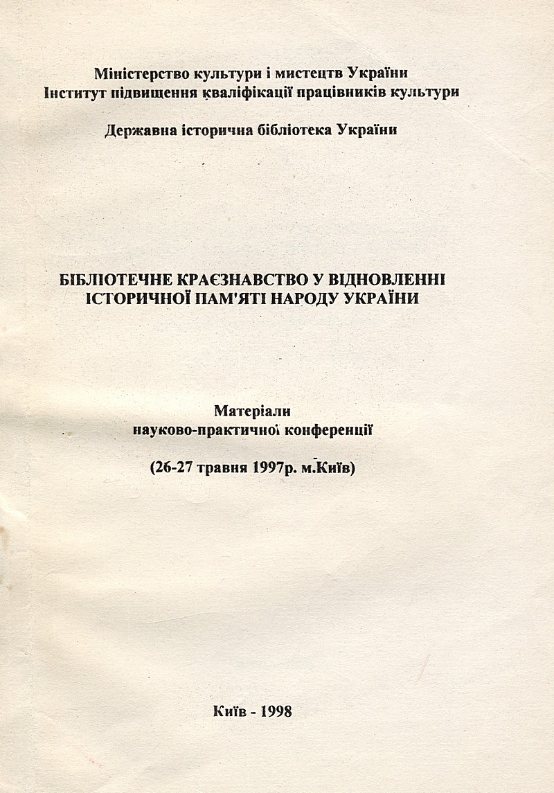 Вийшли в світ матеріали науково-практичної конференції «Бібліотечне краєзнавство у відновленні історичної пам’яті народу України», яка відбулася 26-27 травня 1997 р. (К., 1998. 249 с.)