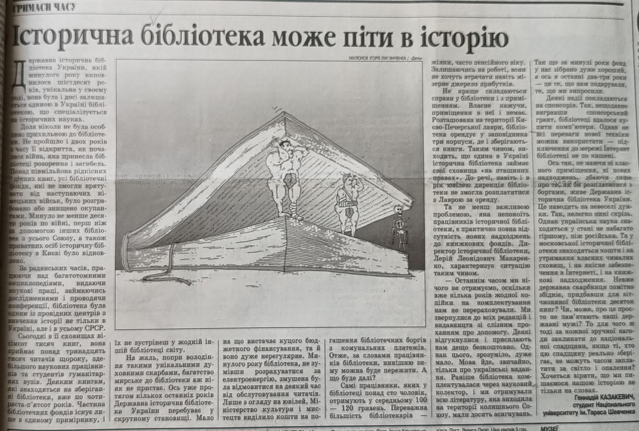 Кінець 1990-х років - це складний час для Бібліотеки. Однак, працівники книгозбірні боролися за порятунок своє книгозбірні, зокрема, активно залучалася преса: в публікаціях цього часу акцентувалася увага на незадовільному матеріальному становищі Бібліотеки.