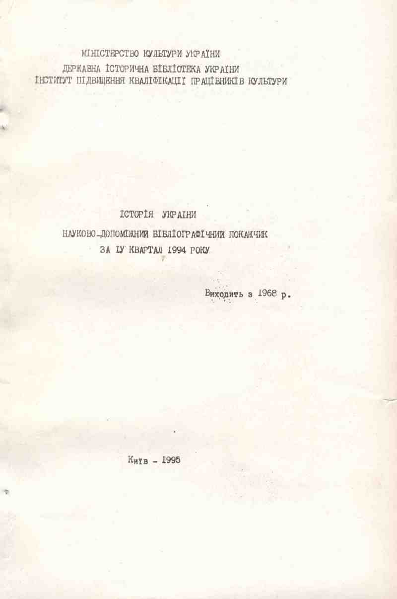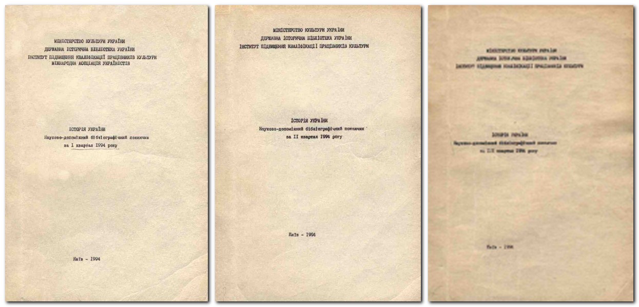 Фахівці ДІБУ випробували новий підхід з підготовки покажчика «Історія України» - щоквартальні випуски: надруковано покажчики за І-ІІІ кв. 1994 року.
