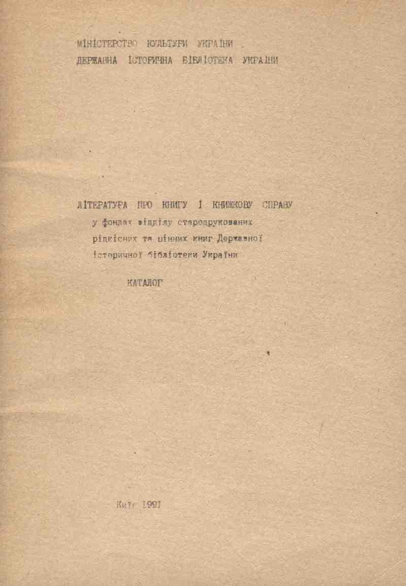 Література про книгу і книжкову справу у фонду відділу стародрукованих рідкісних та цінних книг Державної історичної бібліотеки України : каталог. Київ. 1991. 99 с.