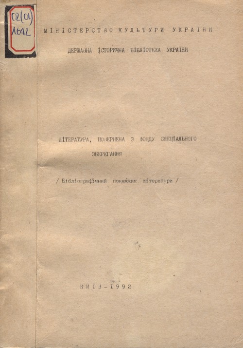 Література, повернена з фонду спеціального зберігання: бібліографічний покажчик літератури / склад.: Л. Алєксандрова, І. Пташник, Н. Селівачова. Київ, 1992. 202 с.