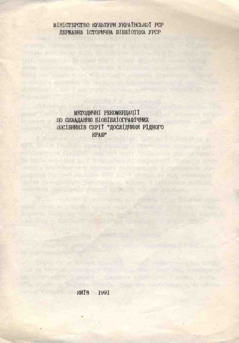 Методичні рекомендації по складанню біобібліографічних посібників серії «Дослідники рідного краю» / підгот. В. П. Кисельова. Київ, 1991. 7 с.