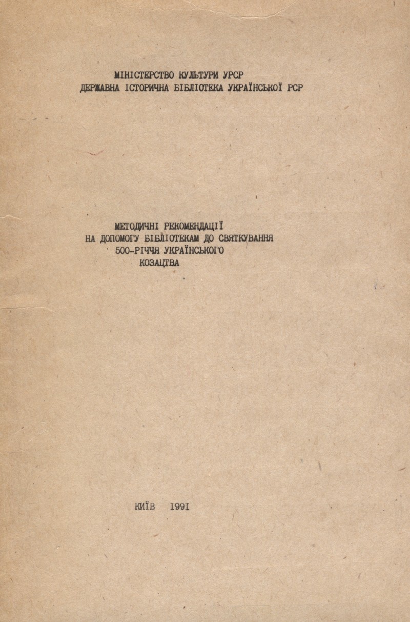 Методичні рекомендації на допомогу бібліотекам до святкування 500-річчя українського козацтва / склад. В.П. Кисельова. Київ, 1991. 110 с.