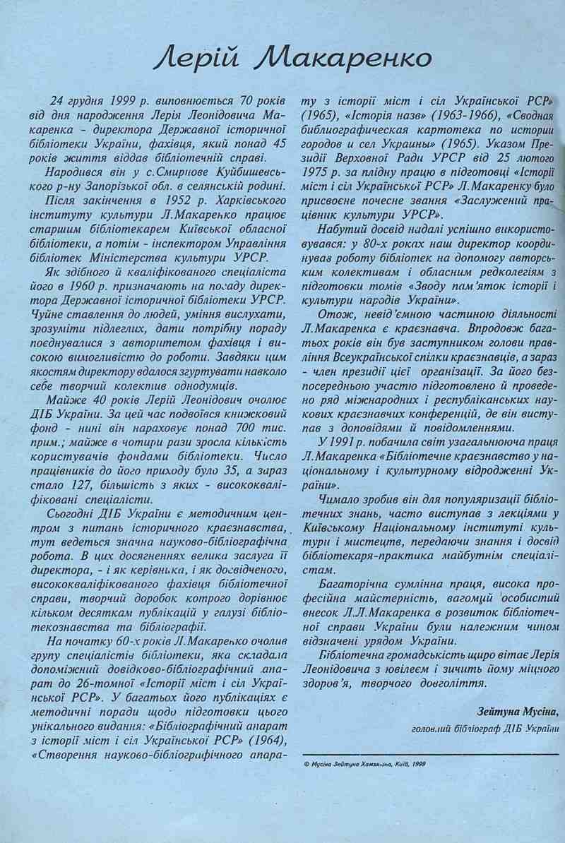 Зокрема, у «Бібліотечному віснику» опубліковано статтю до 70-річного ювілею її директора – Лерія Леонідовича Макаренка, який обіймав цю посаду майже 40 років поспіль