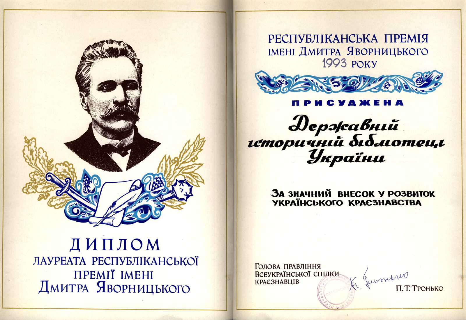 За значний внесок у розвиток краєзнавства в 1993 році Державна історична бібліотека України удостоєна премії ім. Д. Яворницького.