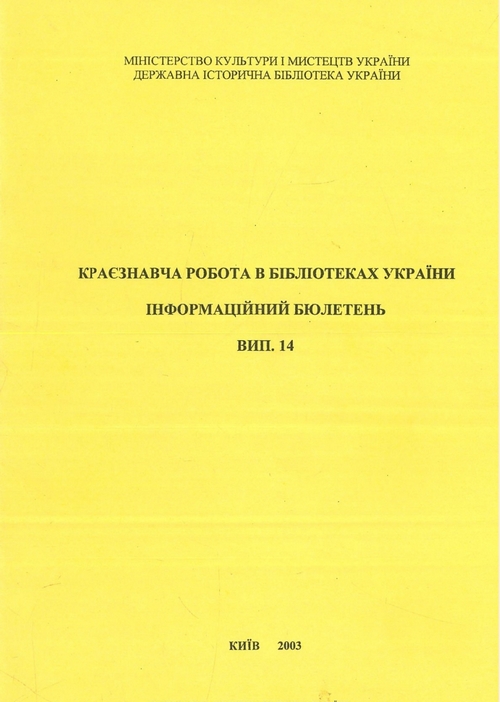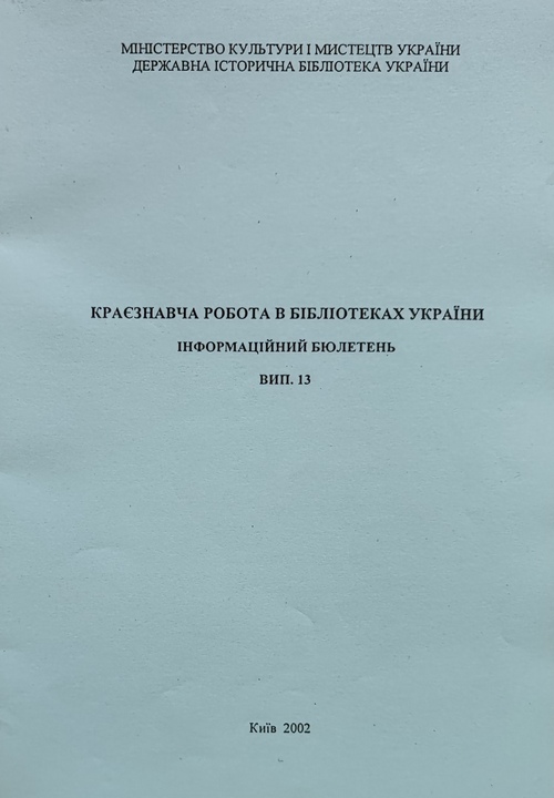 13-й випуск інформаційного бюлетеню «Краєзнавча робота в бібліотеках України», що містить відомості про діяльність бібліотек системи Міністерства культури і мистецтв України з підготовки і видання краєзнавчих бібліографічних посібників за 1996-2000 роки за підсумками науково-дослідної роботи Державної історичної бібліотеки України. |