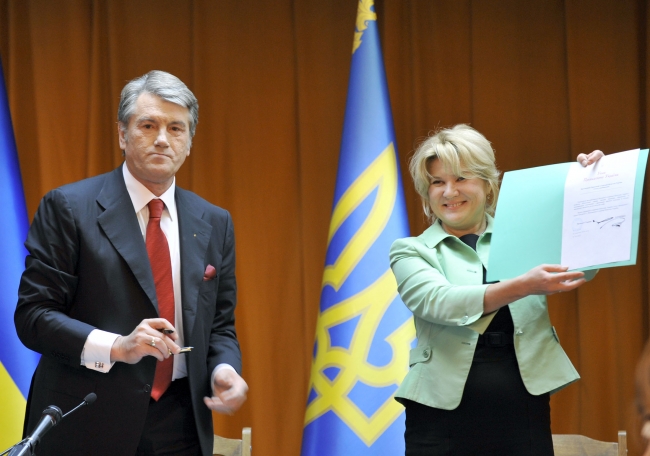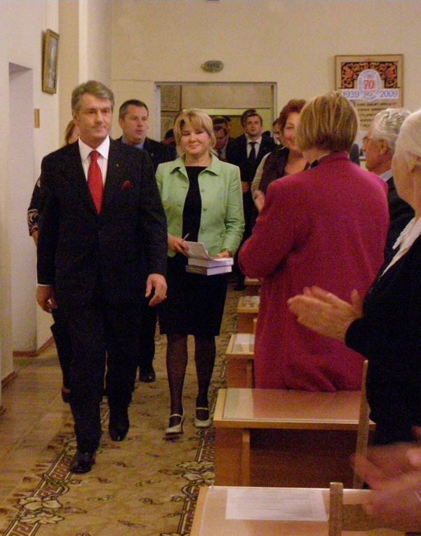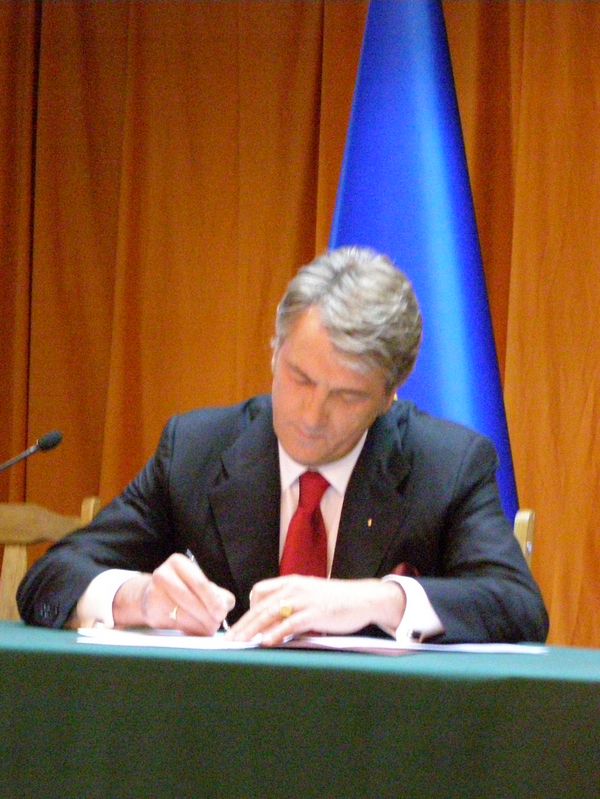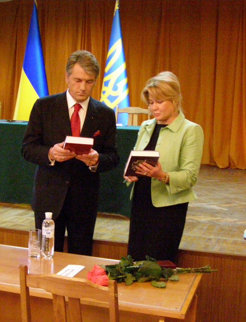 | Президент Україні Віктор Ющенко та директор Державної історичної бібліотеки України Алла Скорохватова в читальній залі Бібліотеки | Президент Україні Віктор Ющенко підписує Наказ про надання Державній історичній бібліотеці України статусу Національної |