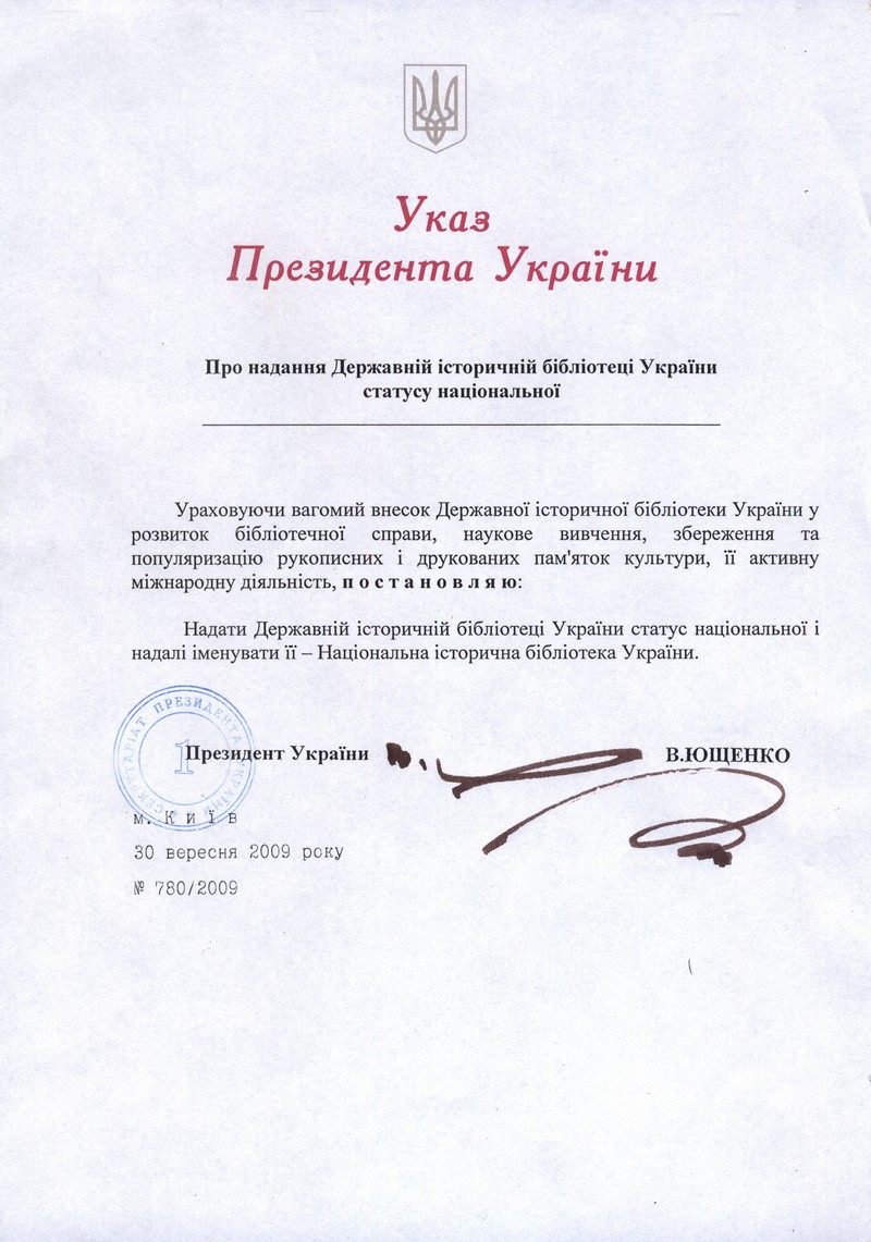 З нагоди професійного свята – Всеукраїнського дня бібліотек – Президент України Віктор Ющенко підписав Указ «Про надання Державній історичній бібліотеці України статусу Національної» (30 вересня 2009 року № 780/2009)