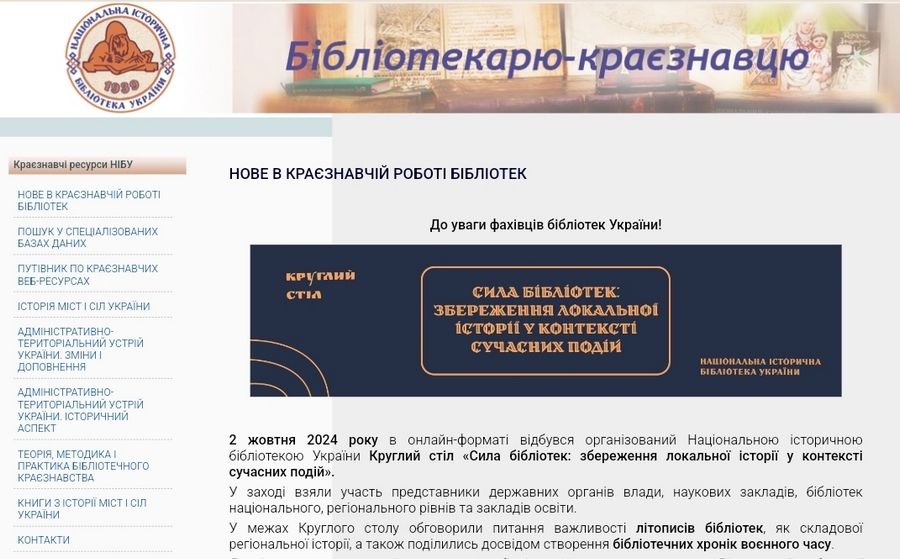 З метою інформаційного забезпечення та надання методичної допомоги бібліотечним фахівцям з різних аспектів краєзнавчої бібліотечної діяльності науково-методичним відділом спільно з відділом телекомунікаційних технологій та електронних ресурсів розроблено і розміщено на офіційному сайті НІБУ спеціалізовану сторінку «Бібліотекарю краєзнавцю».