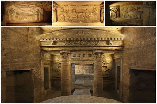 Підземні катакомби Ком ель-Шукафа на південно-західній околиці Олександрії є найбільшим римським кладовищем в місті. Будова, що відноситься до I і II ст. н.е., була виявлена в 1900 році при розробці кам'яного кар'єру. Катакомби Ком ель-Шукафа – це підземний архітектурний комплекс, де в три яруси розташовані гробниці знаті. На жаль, два нижніх яруси залиті підґрунтовими водами – поруч Середземне море. Під землю тут ведуть гвинтові сходи, по якій можна спуститися в ротонду на глибині тридцяти метрів. Від ротонди в сторони розходяться численні зали та похоронні камери з вирубаними прямокутними нішами для саркофагів. Внутрішні стіни катакомб позбавлені декору. Єдина «прикраса» – розпис у жалобній каплиці або молитовному залі. На стіні висічено звичайний мотив давньоєгипетського похоронного обряду: Анубіс схилився над ложем, на якому лежить мумія, поруч стоять супутники – Ісіда і Гор. |