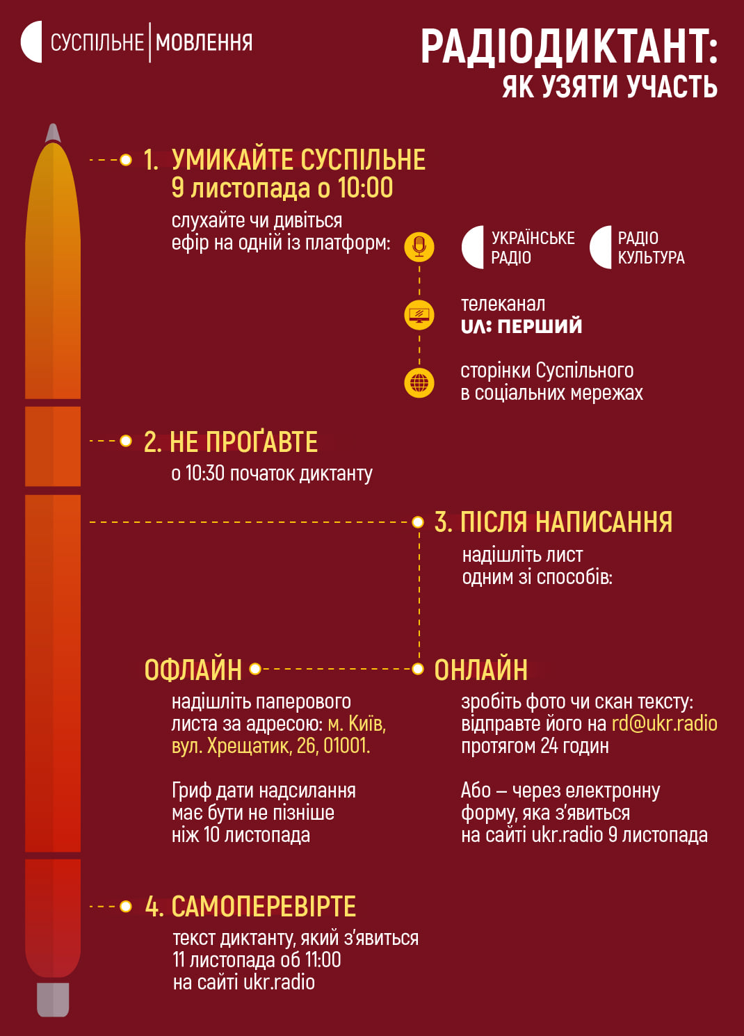 Онлайн свій диктант можна надіслати за адресою rd@ukr.radio. Після оприлюднення диктанту електронні листи не прийматимуть.