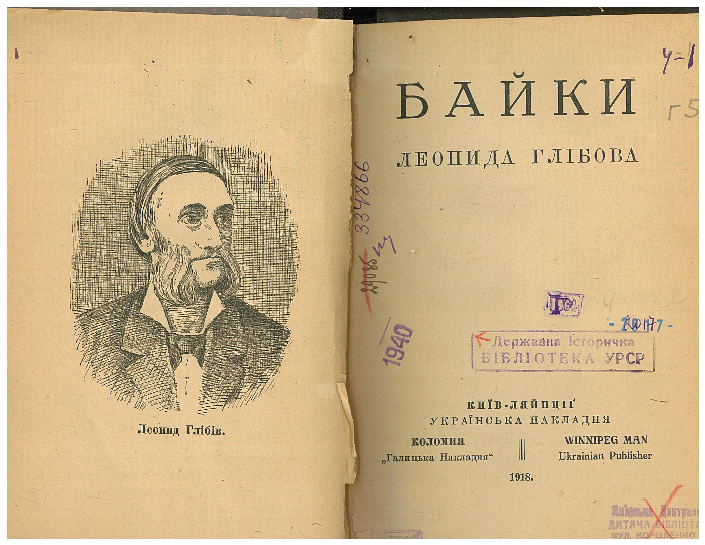 4. Глібов Л. І. Байки / Л. І. Глібов ; передм. Б. Л. [ Б. С. Лепкого]. – Київ ; Ляйпціг : Коломія-WinnipegMan, 1918. – 64 с. : портр.