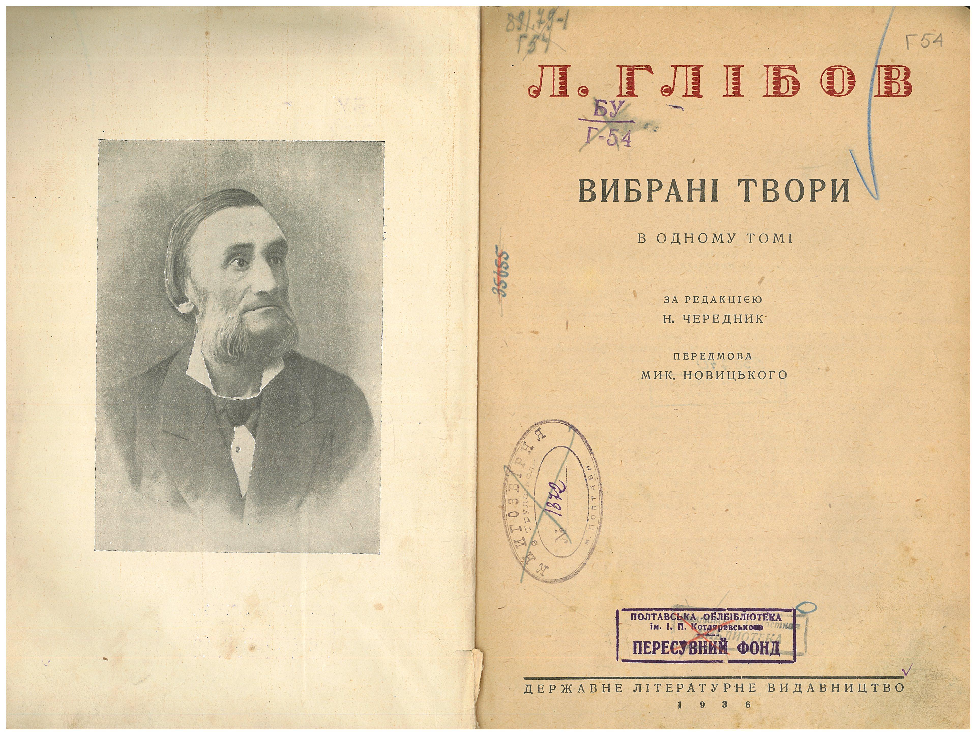 5. Глібов Л. І. Вибрані твори : в одному томі / Л. Глібов ; за ред. Н. Чередника ; передмова Мик. Новицького.– Харків : Держ. літ. вид-во, 1936. – 126 с., портр.