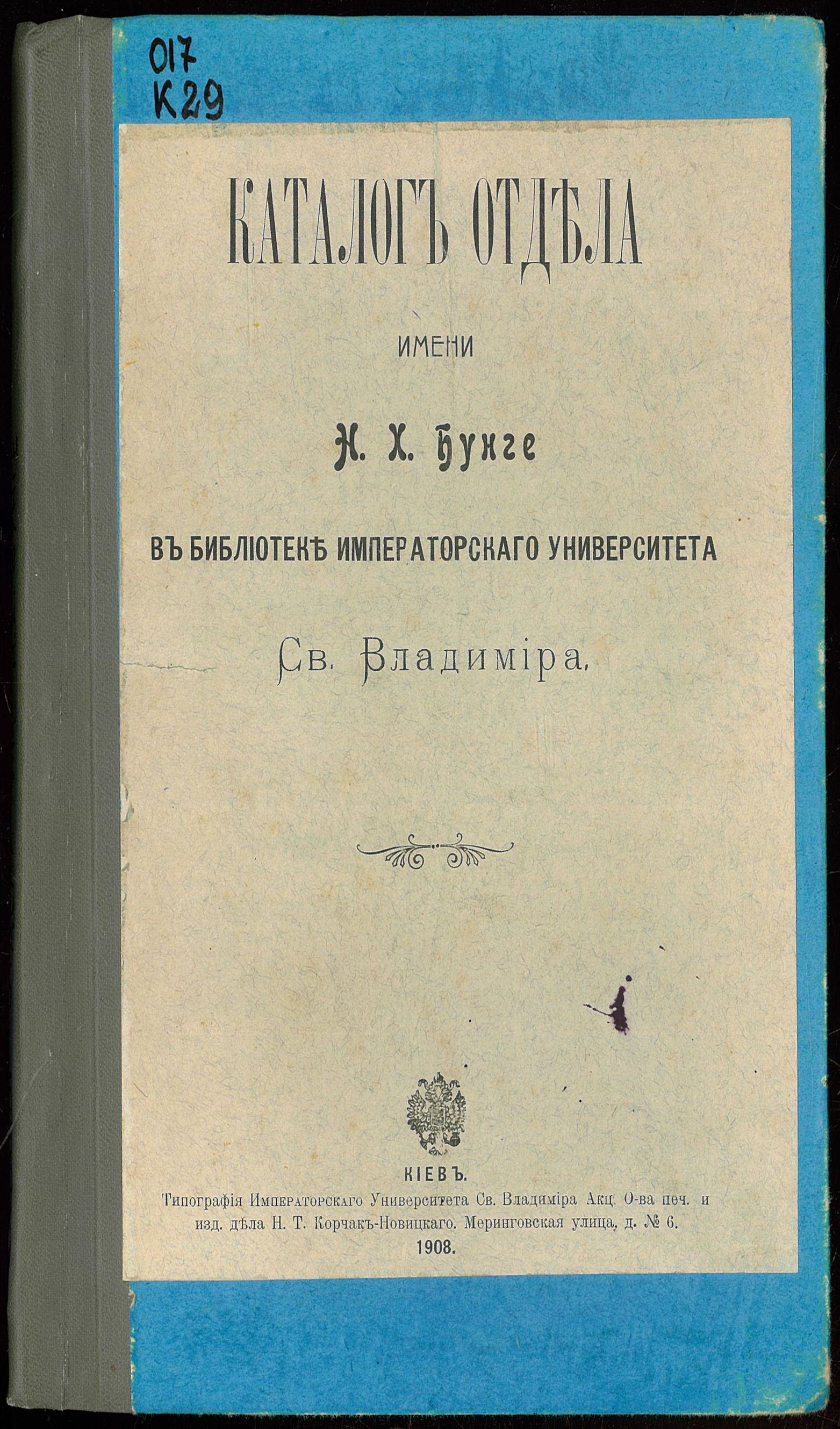 Каталог отдела имени Н. Х. Бунге в Библиотеке Императорского Укиверситета Св. Владимира / Университет Св. Владимира (Киев). - Киев : Типография Императорского Университета Св. Владимира Акц. О-ва печ. и изд. дела Н. Т. Корчак-Новицкого, 1908. - 274, VIII с. - Оттиск из Университетских Известий 1908 года. |