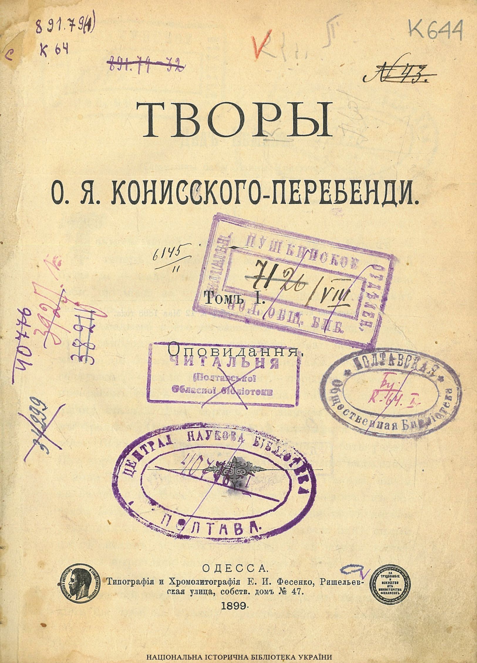 Кониський-Перебендя, Олександр Якович. Твори О. Я. Конисского-Перебенди . Т. 1. Оповідання / О. Я. Кониський. - Одесса : Тип. и хромолитогр.Фесенка, 1899. - 223, [1] с. |