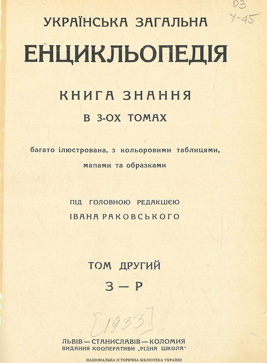 Українська загальна енциклопедія. Книга знання : багато ілюстрована, з кольоровими таблицями, мапами та образкамив 3 т., Т. 2 : З–Р / голов. ред. І. Раковський. - Львів : Рідна школа, [1933]. - 1312 с. |