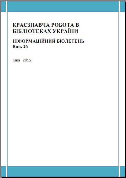 Краєзнавча робота в бібліотеках України: інформ. бюл. Вип. 26 / Нац. іст. б-ка України; підгот.: В.П. Кисельова, О.В. Михайлова, І.В. Чеховська; ред. Т.С. Кудласевич. - Київ, 2015. - 188 с. |