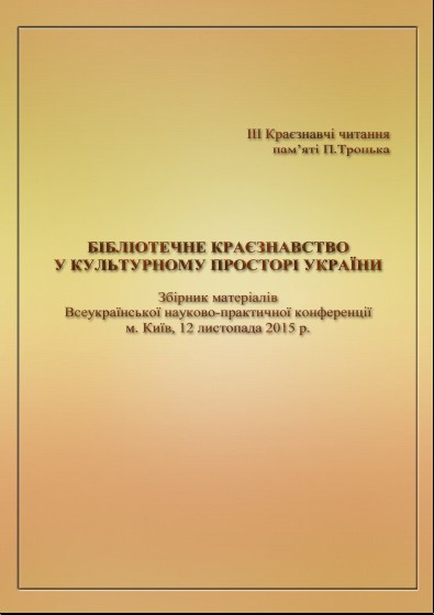 Бібліотечне краєзнавство у культурному просторі України: збірник матеріалів Всеукраїнської науково-практичної конференції пам'яті Петра Тронька, м. Київ, 12 листопада 2015 р. : [Електронний ресурс]. - Київ, 2015. - 270 с. - (ІІІ Краєзнавчі читання пам'яті Петра Тронька) |