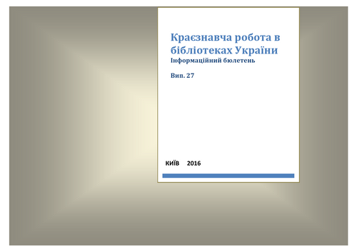 Краєзнавча робота в бібліотеках України: інформ. бюл. Вип. 27 / Нац. іст. б-ка України ; підгот.: В. П. Кисельова, О. В. Михайлова ; ред.: Т. С. Кудласевич, І. В. Чеховська - Київ, 2016. – 134 с. |