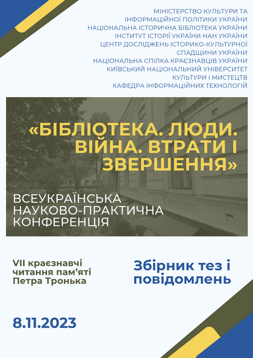 Бібліотека. Люди. Війна. Втрати і звершення: зб. тез і повідомлень Всеукр. наук.-практ. конф., 8 листоп. 2023 р. / М-во культури та інформ. політики України, Нац. іст. б-ка України, Ін-т історії України НАН України, Центр дослідження історико-культурної спадщини України, Нац. спілка краєзнавців України, Київ. нац. ун-т культури і мистецтв, кафедра інформ. технологій; ред. кол.: А. Скорохватова (голова), Н. Волошінська, Т. Спанчак, О. Михайлова, Р. Маньковська, Т. Новальська, О. Покропивна, М. Цінська. – Київ, 2023. – 394 с. – (Сьомі Краєзнавчі читання пам’яті Петра Тронька).