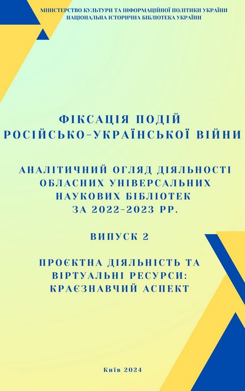 Фіксація подій російсько-української війни: аналітичний огляд діяльності обласних універсальних наукових бібліотек України за 2022-2023 рр. Вип. 2: Проєктна діяльність та віртуальні ресурси: краєзнавчий аспект / Національна історична бібліотека України; підгот. М. Цінська; ред. : В. Кисельова, І. Однопозов ; відп. за вип. А. Скорохватова. – Київ, 2024. - 35 с.