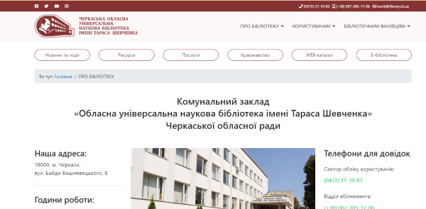 - Контакти - адреса, графік роботи, номери телефонів для довідок, адреси електронних поштових скриньок бібліотеки та інформація про санітарний день;