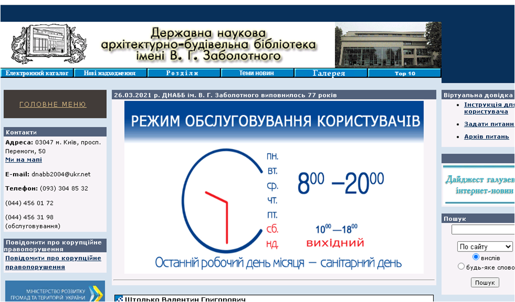- "Бібліотечні будівлі", в рамках якого вивчаються проблеми проектування та будівництва бібліотечних будівель в Україні;