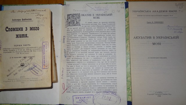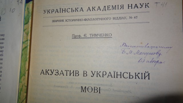 Тимченко Євген Костянтинович. Акузатив в українській мові : (з української складні) / проф. Є. Тимченко; Українська академія наук; Історично-філологічний відділ. – Київ : Друк. Укр. академії наук, 1928. – 101 с. – (Збірник Історично-філологічного відділу; № 67). – [Інскрипт]: «Високоповажаному Б.М. Ляпунову від автора».