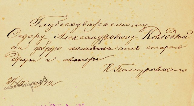 [Текст інскрипту] : «Глубокоуважаемому Федору Александровичу Колодий на добрую память от старого друга и автора К. Болсуновского. 24 / ІІ-1912».