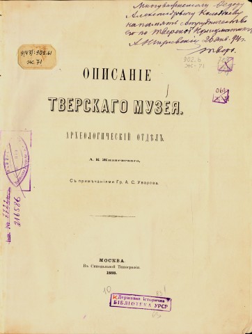 І. Жизневский, А. К. Описание Тверского музея : археологический отдел [Текст] / А. К. Жизневский ; прим. гр. А. С. Уварова. - Москва : Синод. тип., 1888. - 242, XVIII с. : рис., фот. 18 л. ил.