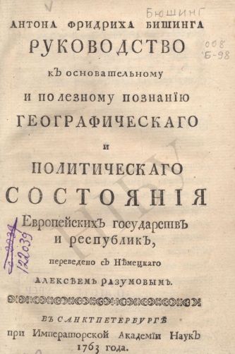 Бюшинг Антон Фридрих. Руководство к основательному и полезному познанию географического и политического состояния европейских государств и республик / А. Бишинг ; пер. с нем. А. Разумов. – Санкт-Петербург : Тип. при Императ. Акад. наук, 1763. – 10, 180 с.