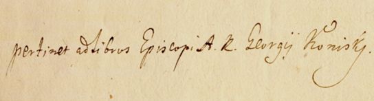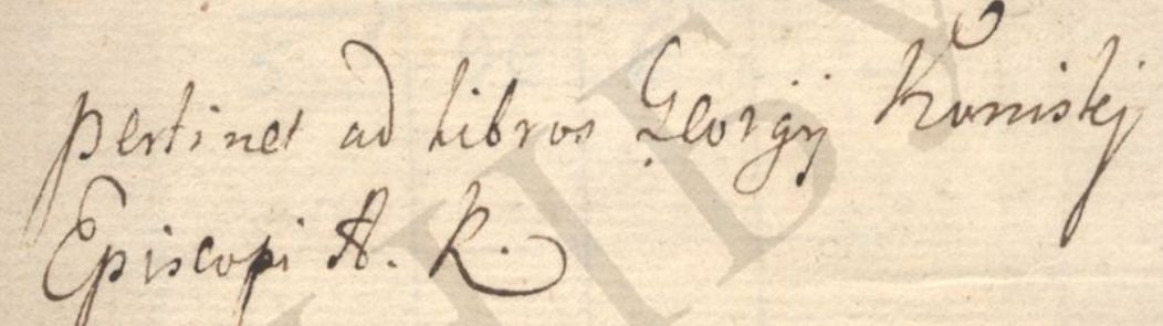 [Текст власн. напису Георгія Кониського] : «Pertinel ad libros Georgij Koniskj Episcopi A.R.». [Переклад: «Належить до книг Георгія Кониського, Єпископа Б. Р. (Білої Русі)»]. |