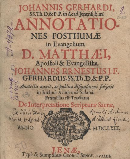 Gerhardus Iohannes Ernestus J. F. Annotationes posthumae in Evangelium D. Matthaei apostoli & Evangelistae / Iohannes Ernestus J.F. Gerhardus. – Jena : Typis & Sumpubus Georg l Senge, 1663. – 1926 с.