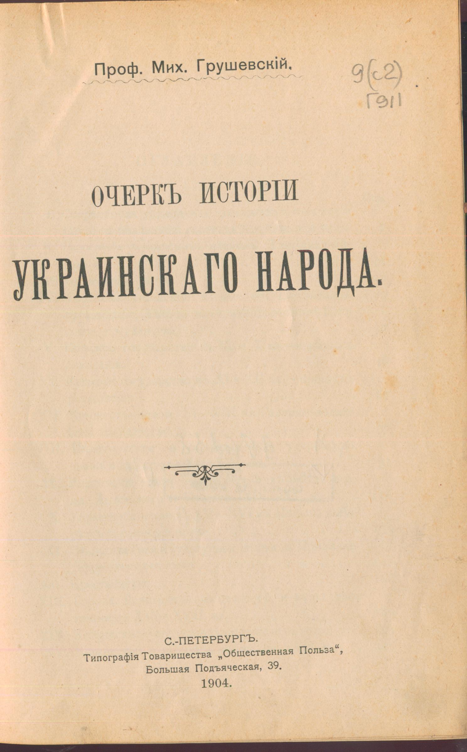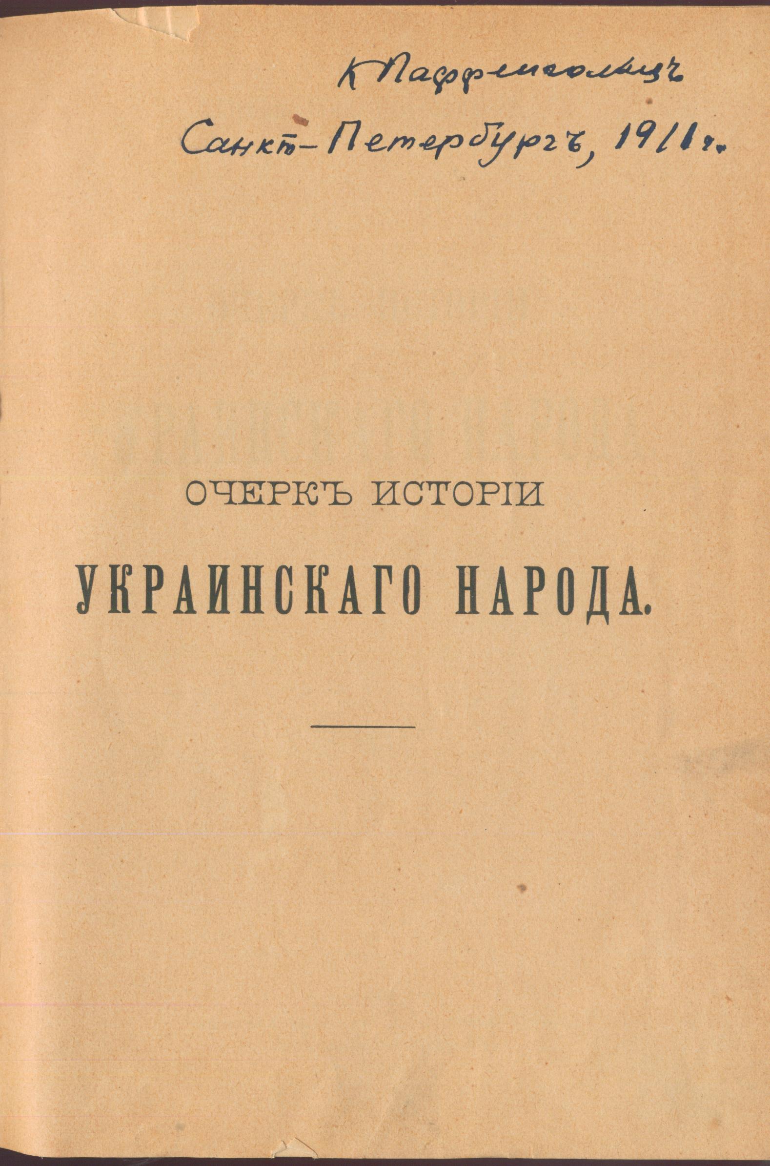 Грушевский, Михаил Сергеевич. Очерк истории украинского народа / Мих. Грушевский. – Санкт-Петербург : Тип. Товарищества "Общественная польза", 1904. – 380 с. – [Власницький напис на шмуцтитулі:] «К. Паффенгольцъ Санкт-Петербург, 1911 г.».