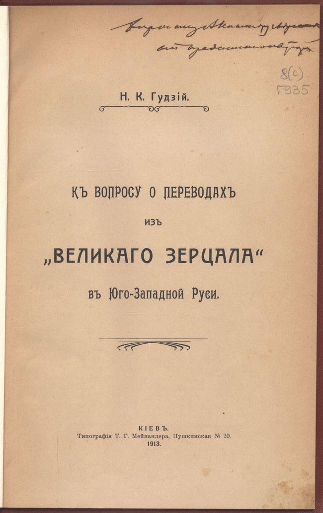 Гудзий, Николай Каллиникович. К вопросу о переводах из "Великого зерцала" в Юго-Западной Руси / Н. К. Гудзий. - Киев : Тип. Т. Г. Мейнандера, 1913. - 42 с. - "Дорогому Александру Адриановичу от преданного автора". - [Окремий вiдбиток з вид. : Чтения Исторического общества Нестора Летописца. - Т. 23. - Вып. 2. - Киев, 1913. - С. 3-42.]. |