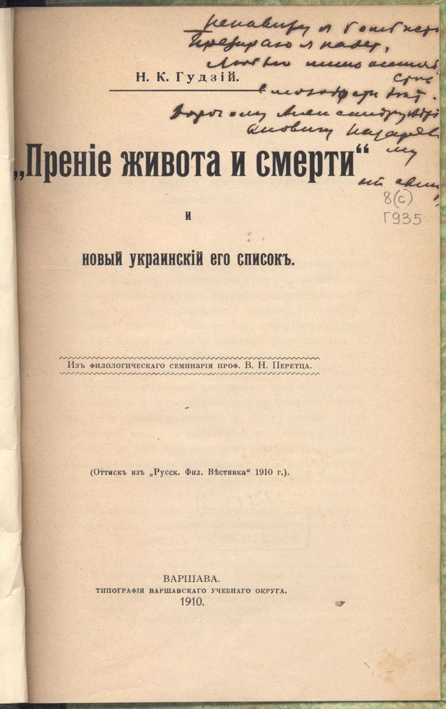 Краще за всiх про цю роботу вже на схилі рокiв розповiв сам автор. З 1957 р. професор Московського унiверситету, академiк АН Української РСР М. К. Ґудзiй очолював віддiл давньої української літератури академiчного Iнституту лiтератури. У 1960-му за його редакторства та з його передмовою вийшла збiрка "Українськi iнтермедiї XVII-XVIII ст.". У цiй передмовi, читати яку - суцiльне задоволення, Микола Ґудзiй пише: "На поширений сюжет написана українська "Iнтермедiя на три персони: смерть, воин и хлопец". Тема її - суперечка людини зi смертю - була дуже популярною, […] зокрема, в нiмецьких масляничних виставах-фастнахтшпiлях. Вона розроблена в перекладнiй нiмецькiй пам'ятцi "Прение живота и смерти", вiдомiй [...] в українських [списках] з XVII ст. Цей твiр вiдбився в пам'ятках [...] української книжної лiтератури, [...] українському фольклорi." [2, .с. 27]. I далі автор дає посилання на свою першу друковану працю, вмiщену в журналi "Русский филологический вестник" (виходив у Варшавi; головним редактором його з 1904 р. був Євфимій Карський, колега й однодумець Володимира Перетца). Iнскрипт на титульному аркушi нашого екземпляра - особливий: "Ненавижу я [?] Презираю я н[авет?] Люблю лишь [...] слов с молодости лет. Дорогому Александру Адриановичу Назаревскому от автора". Є і власницький напис: "А. Назаревский. 25.ХІ.[?]". Микола Каленикович любив i добре знав поезiю символiстiв, був знайомий та листувався з Анною Ахматовою. Крiм того, вiршованi присвяти були, очевидно, традицiйними для учасникiв "вiльного наукового спiвтовариства" - Семiнарiю. Олександр Назаревський згадував: "Высокий Перетц-воевода / В своем высоком терему / Собрал там множество народа, / Дай, Боже, здравия ему..." — так начиналась шутливая поэма «Семинариада», написанная одним из участников научных собраний в доме профессора В. Н. Перетца". [...] «Первый доклад Николая Каллиниковича в семинарии был сделан в апреле 1908 года на тему "Типы русских метрических систем в поэзии народной и искусственной". Речь здесь шла о метрике, тонике, ритмике. Докладчик, видимо, волновался, не все получалось выразительно, достаточно внятно, и в "Семинариаде", где нашли отражение многие наши первые выступления, дебют Николая Каллиниковича вызвал такую ироническую строчку: "Гудзий бубнит и метротонит...". А ось напрочуд дотепна розповiдь Олександра Адріановича про юнака Ґудзія та його "Прение...": «Худощавый, несколько даже тщедушный молодой человек, очень живой и подвижный, но не совсем ловкий в движениях [...]. Внешний вид его казался иногда болезненным. [...] В октябре 1909 года Николай Каллиникович на одном из заседаний семинария прочитал доклад "Прение живота и смерти в украинской литературе" (то есть "Спор жизни и смерти"). Этот же доклад, в дополненном виде, он повторил в марте 1910 года в Петербурге на заседании Общества любителей древней письменности. [...] Еще в 1907 году в Берлине об этом же памятнике была напечатана [...] работа голландской исследовательницы Анны Круазе ван дер Коп, с которой мы все перезнакомились. [...] И вот случилось так, что в гостях у академика А. А. Шахматова, куда все мы, участники семинария, были приглашены, оба исследователя "Прения" оказались за столом рядом и оживленно разговаривали, точно спорили; да им было о чем и поговорить и поспорить. Я очень хорошо их видел, так как сидел как раз напротив. Контраст был поразительный: пышущая здоровьем, румянощекая, к