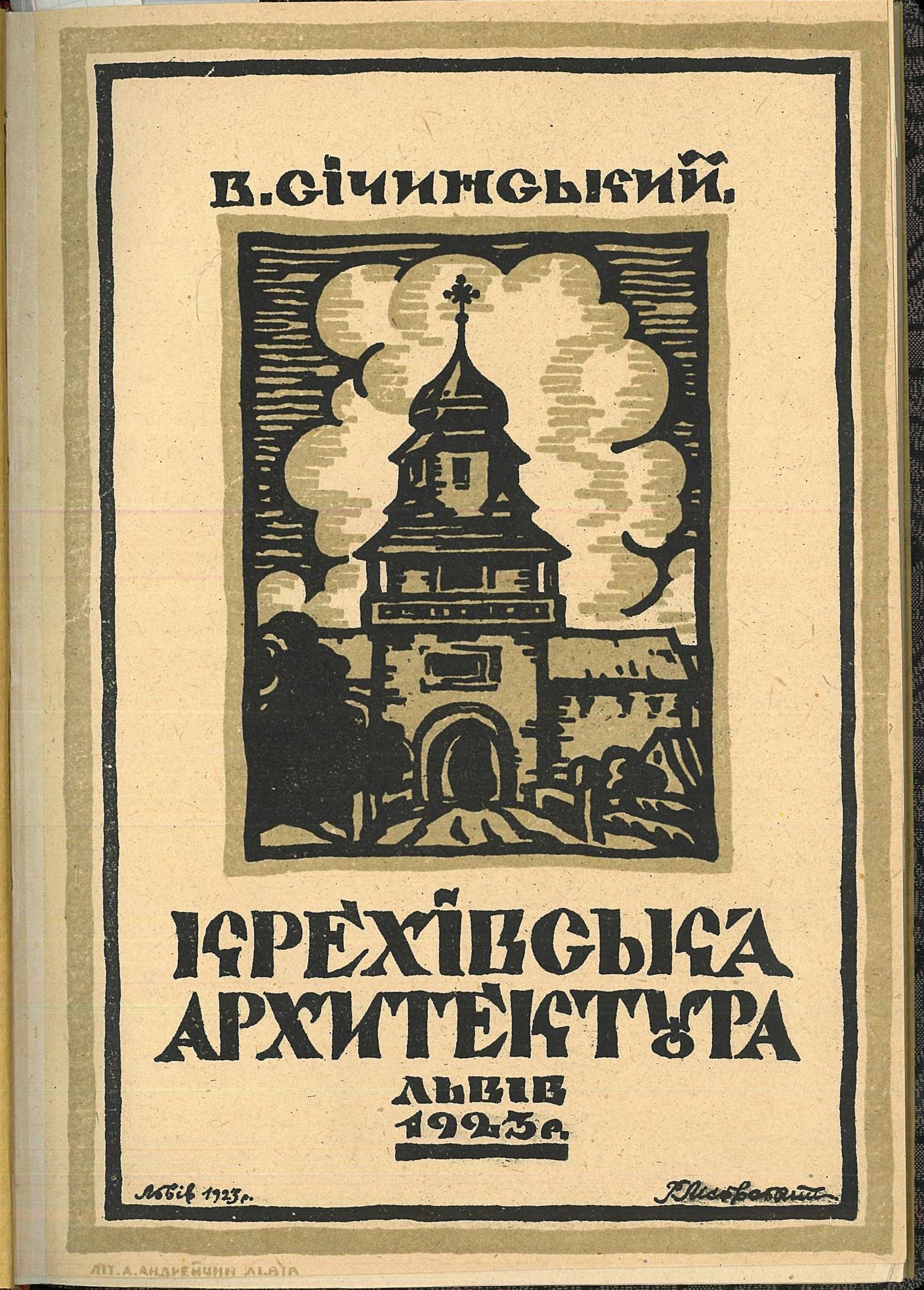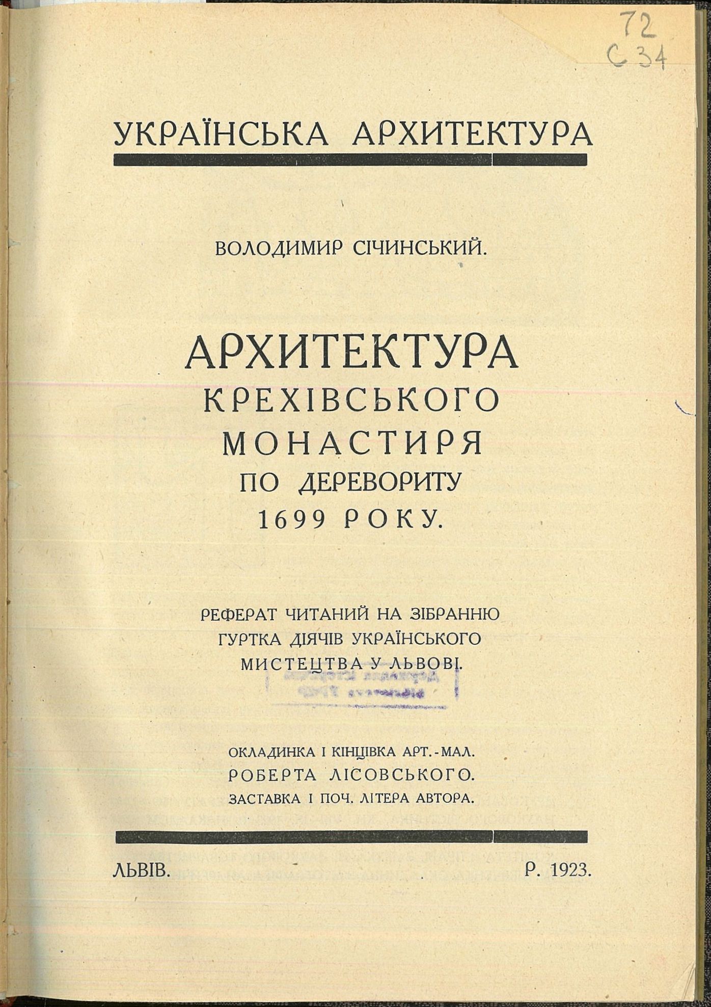 Січинський, Володимир. Архитектура Крехiвського монастиря по деревориту 1699 року : реферат читаний на зiбранню гуртка дiячiв українського мистецтва у Львовi / Володимир Сiчинський ; окладинка i кiнцiвка арт.-мал. Роберта Лiсовського ; заставка i поч. лiтера авт. – Львiв : накл. авт., 1923. – 24 с.; 26 см. – (Українська архитектура). – 500 прим. – Вiдбитка з Лiтературно-наукового вiстника. – Кн. 8-9. 1923 р. – На форзаці наявний художньо виконаний екслібрис: «Книгозбірня Якова Бердичевського». Приплетено: 1. Січинський, Володимир Юхимович. Будівництво міста Потилича : реферат читаний в Історичній секції Наукового товариства ім. Шевченка у Львові / В. Ю. Січинський. – Львів : З друк. Наук. Т-вa ім. Шевченка, 1928. – 30 с. : арк. іл. 2. Січинський, В. Ю. Етруський дім і гуцульський оседок / В. Ю. Січинський. – Прага, 1930. – 15 с. : іл.