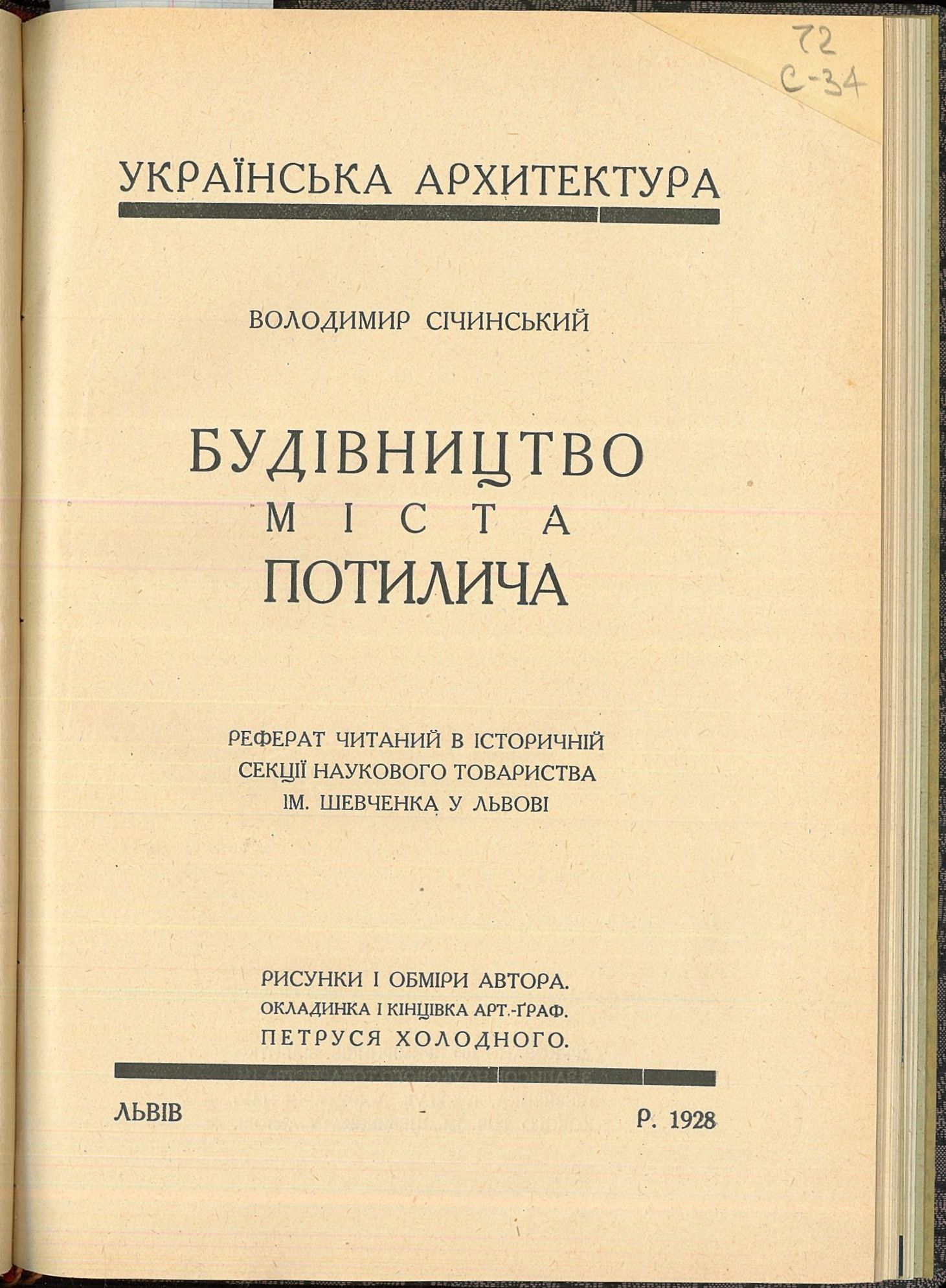 Січинський В. Архітектура старокнязівської доби (Х—XIII ст.) : (з 78 іл.) / В. Січинський. – Прага : Український громадський видавничий фонд, 1926. – 50 с. : 12 арк. іл. – На титульному аркуші наявний штамп Бібліотеки імені Симона Петлюри в Парижі: «Bibliothèque ukrainienne Simon Petlura a Paris».