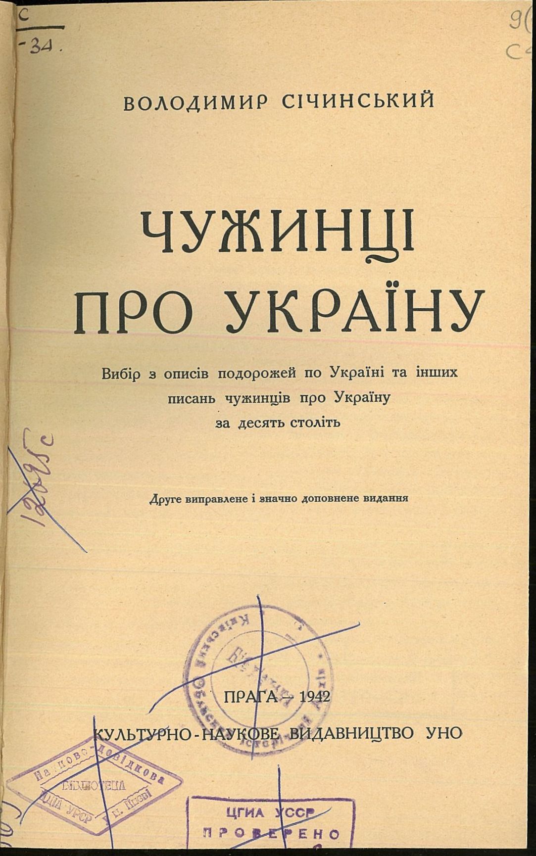 Січинський, Володимир. Чужинці про Україну : вибір з описів подорожей по Україні та інших писань чужинців про Україну за десять століть. – 2-ге, виправлене і значно доповнене вид. / В. Січинський. – Прага : Культурно-наукове Видавництво УНО, 1942. - 243 с. : іл.