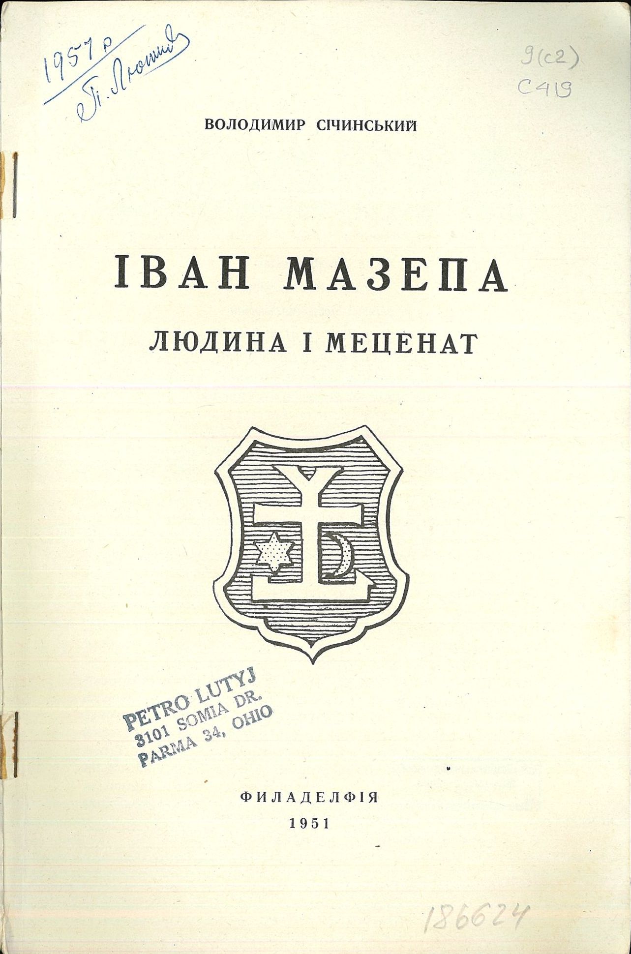 Січинський, Володимир. Іван Мазепа : людина і меценат / В. Січинський. – Филаделфія : Америка, 1951. – 52, [4] с. : іл. – [Іван Степанович Мазепа (1639–1709) – гетьман, борець за інтереси Української козацької держави; військовий, дипломат, меценат, будівничий величних соборів; чи не єдиний справді обдарований поет і музикант-аматор серед українських гетьманів].