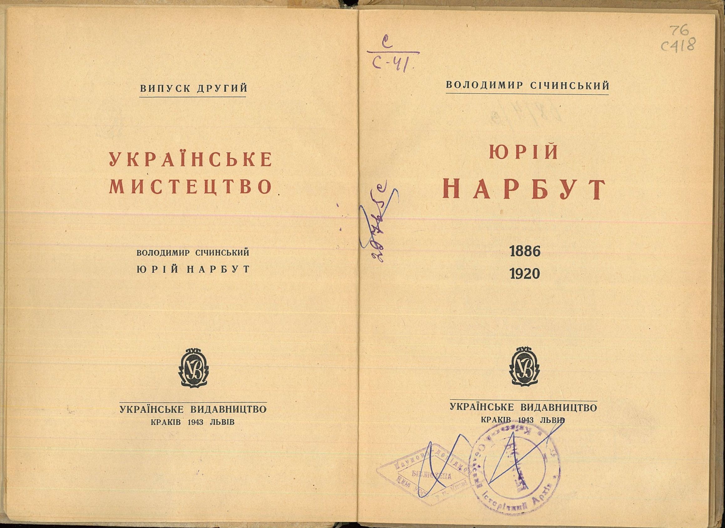 Січинський Володимир Юхимович. Юрій Нарбут. 1886-1920 / Володимир Січинський. – Краків ; Львів : Укр. вид-во, 1943. – 62, [1] c. : іл. – С. 45.